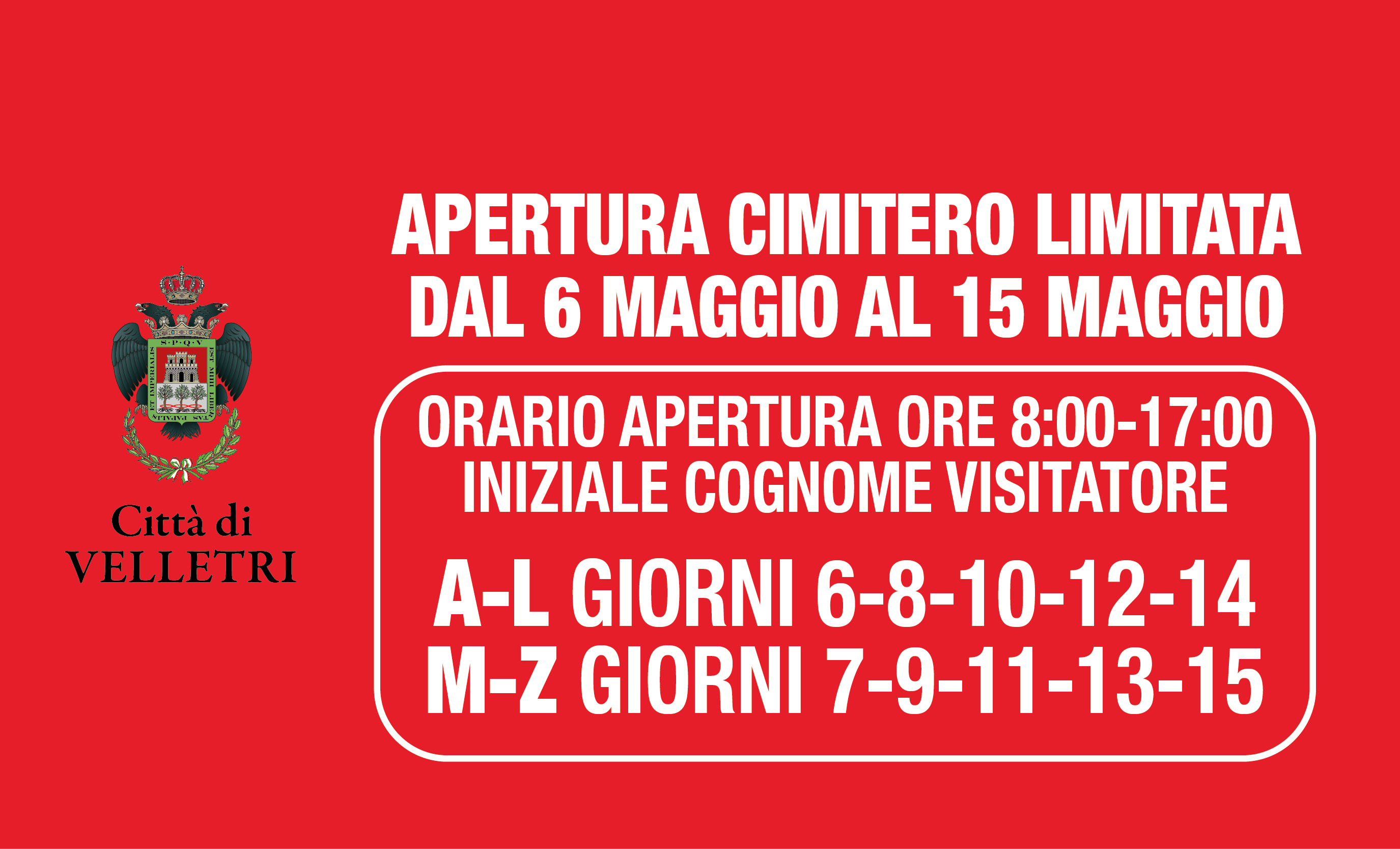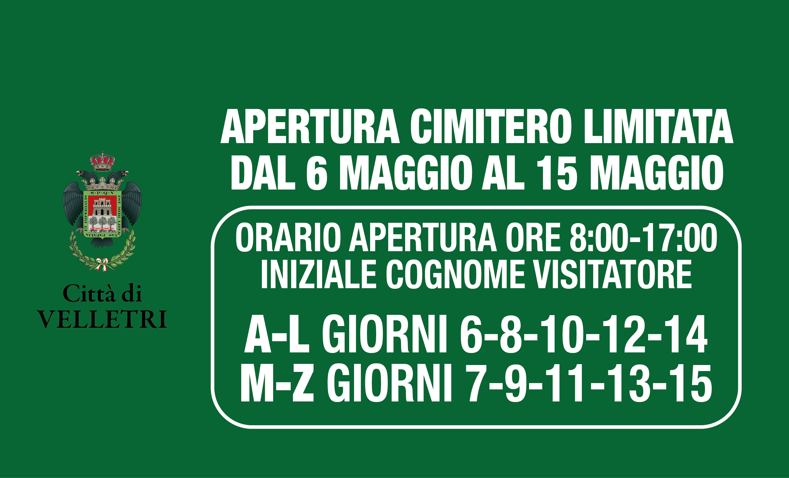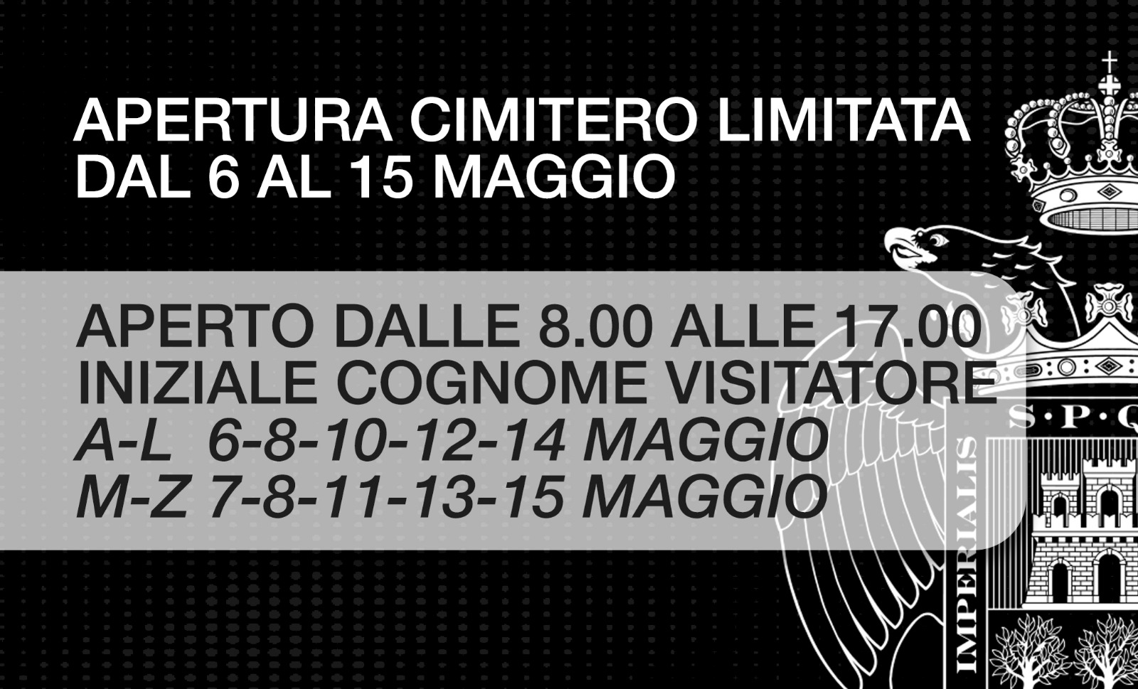 Il sindaco ha firmato l'ordinanza 103 con la quale dispone l'apertura ad accesso limitato del cimitero a partire dal 6 maggio quando sarà consentito entrare in base alla iniziale del cognome del visitatore con orario d'ingresso 8:00 - 17:00.