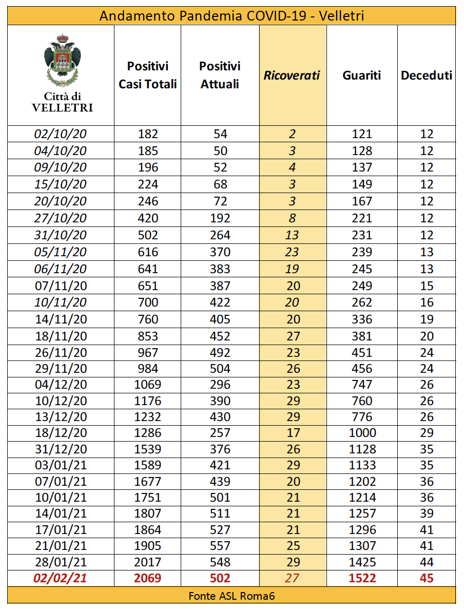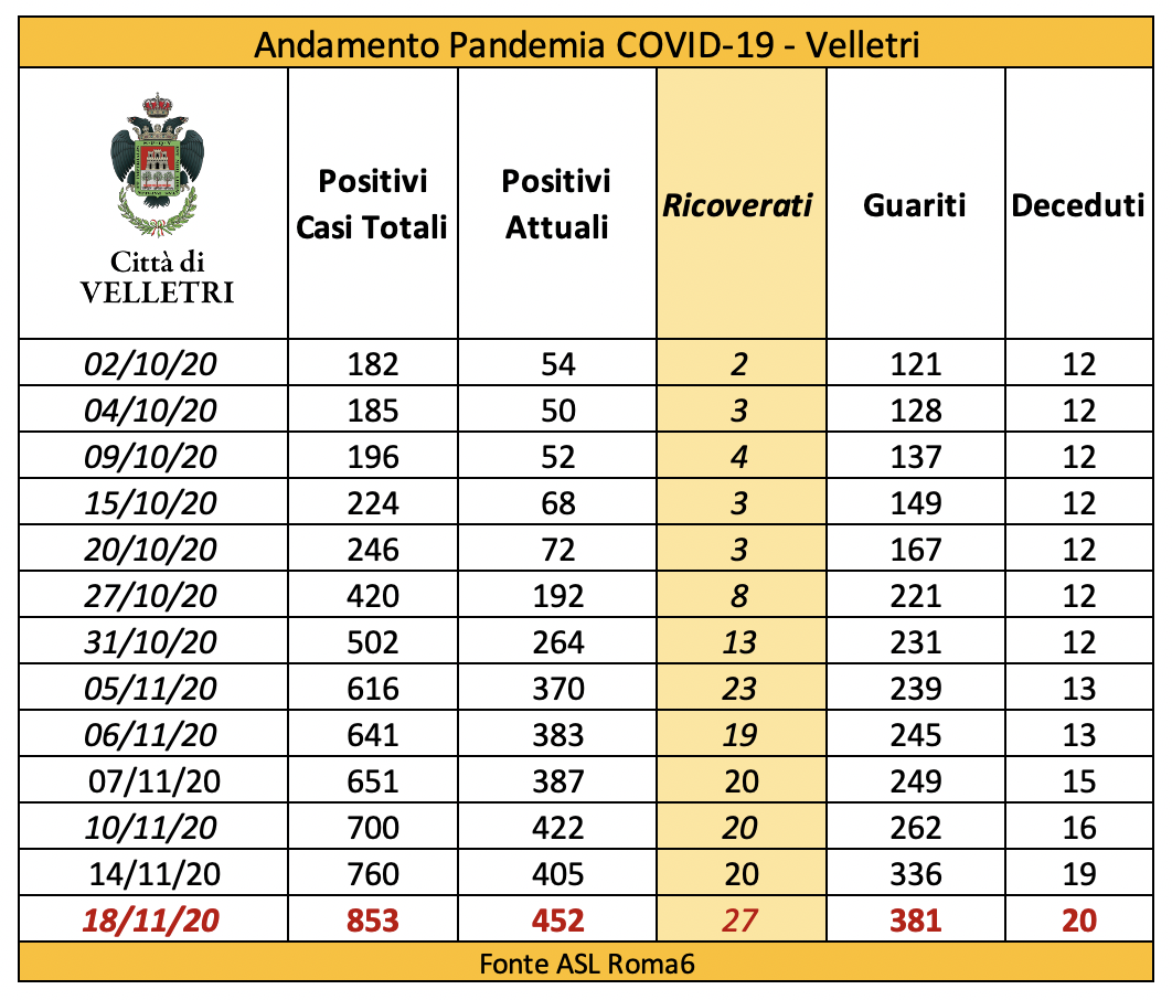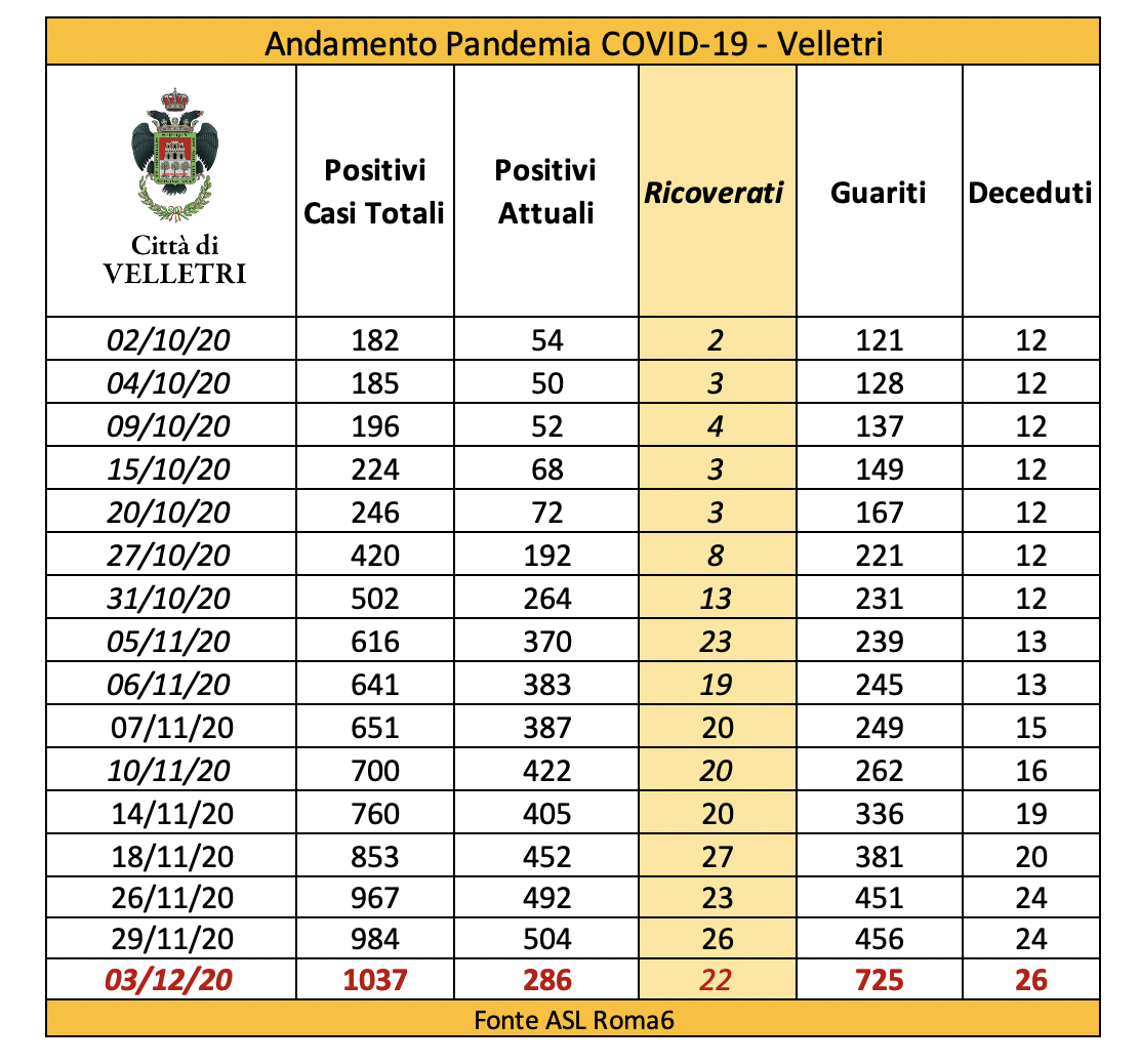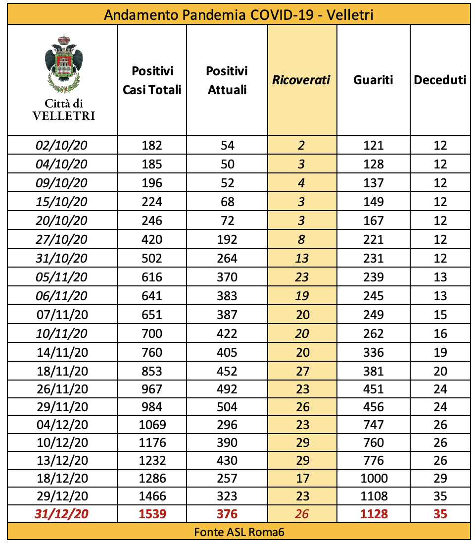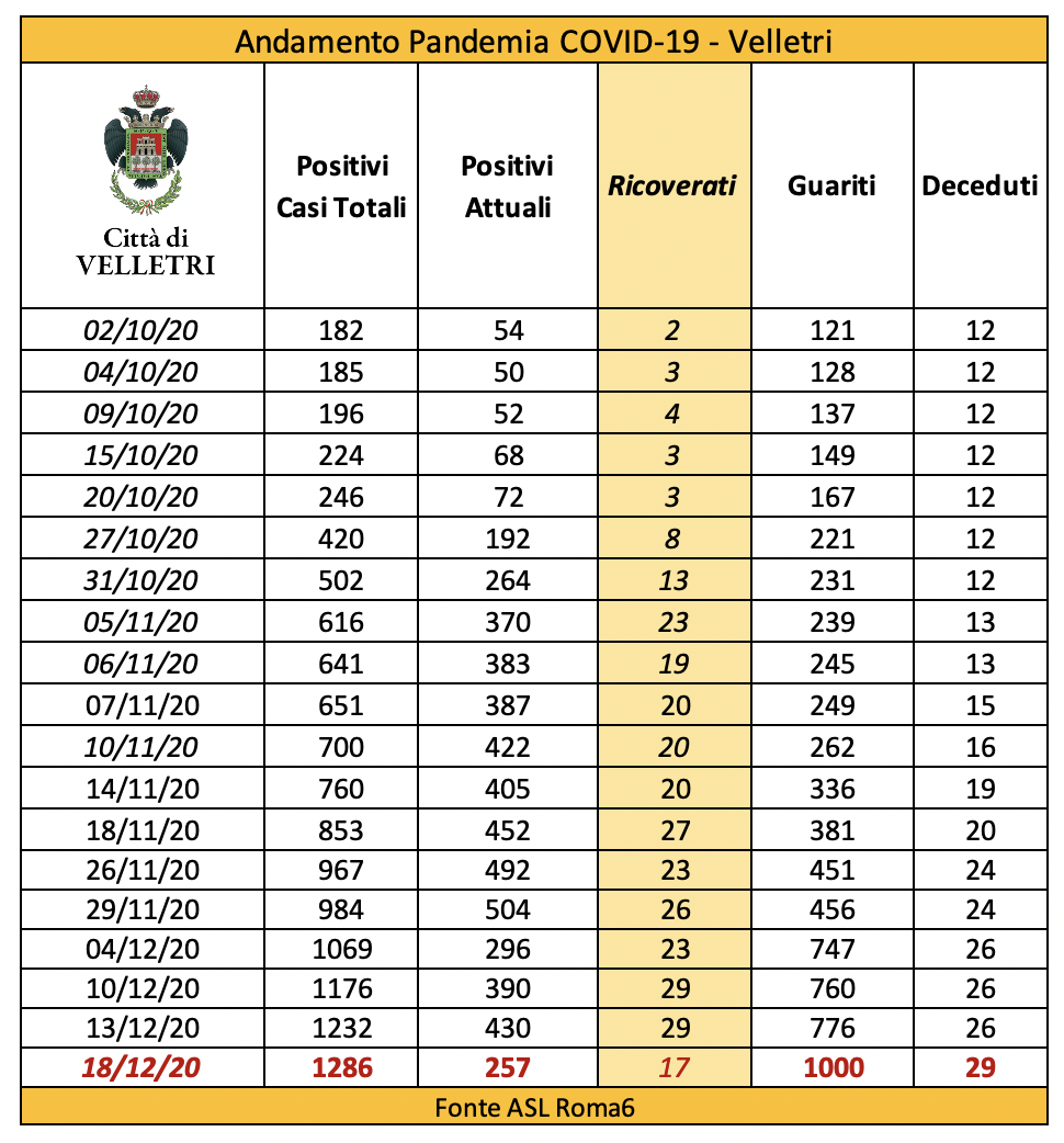In seguito alla segnalazione del Comune di Velletri e dopo un lavoro attento di bonifica dei dati, è stata aggiornata la tabella della pandemia a Velletri. Il numero delle persone attualmente positivi si è ridotto drasticamente come già accaduto in altri comuni. Prima di procedere con la comunicazione formale abbiamo anche fatto un confronto con i dati rilevati dalla Volsca che è impegnata nella raccolta speciale dei rifiuti presso le famiglie dei cittadini colpiti dal virus. La compatibilità di tutte le informazioni ci consente di eseguire una fotografia attendibile e anche confortante vista la curva in crescita delle ultime settimane. Purtroppo, si registrano 2 decessi in più rispetto alla precedente rilevazione.