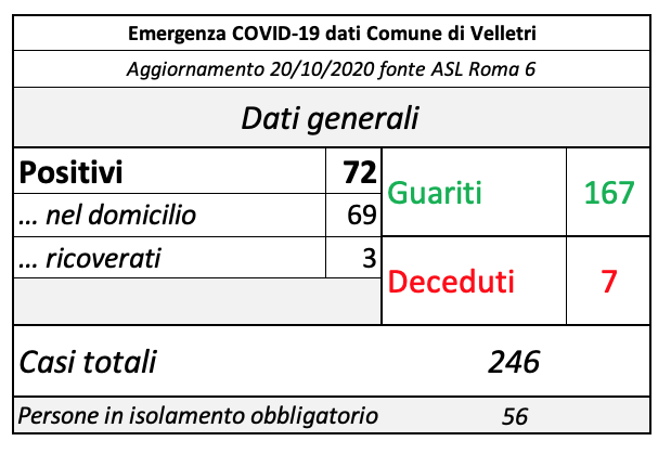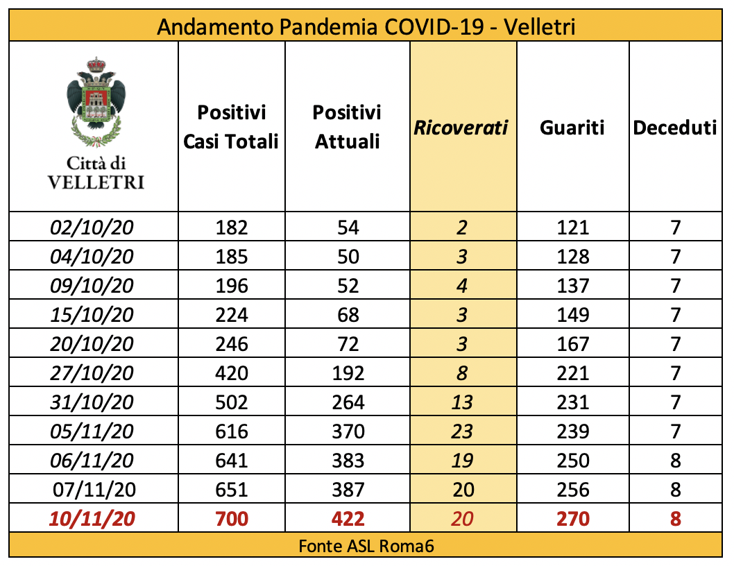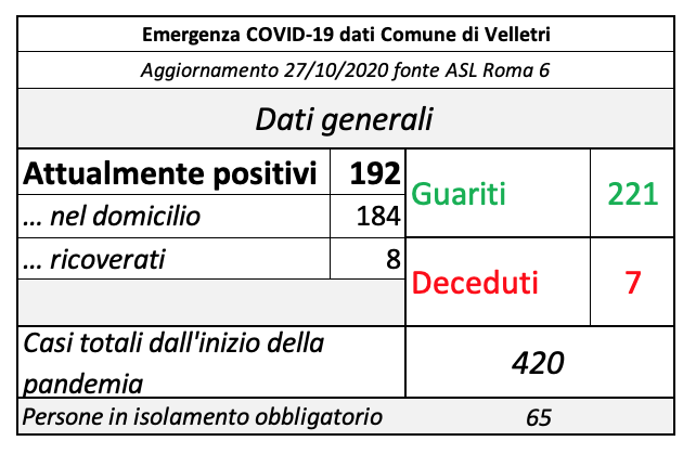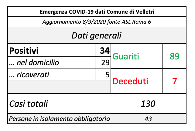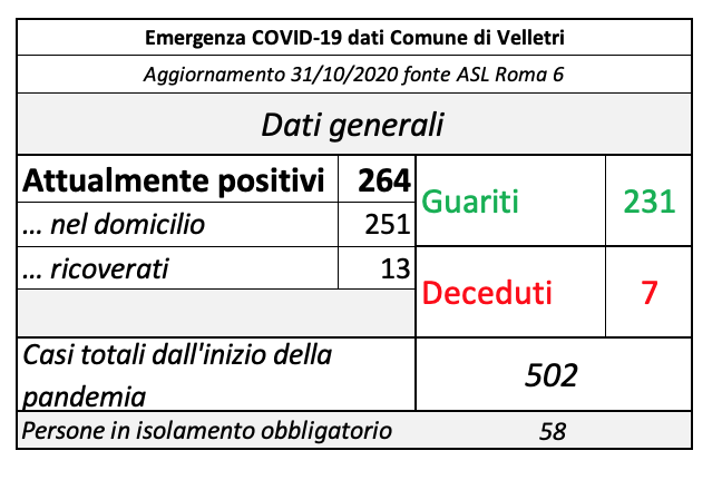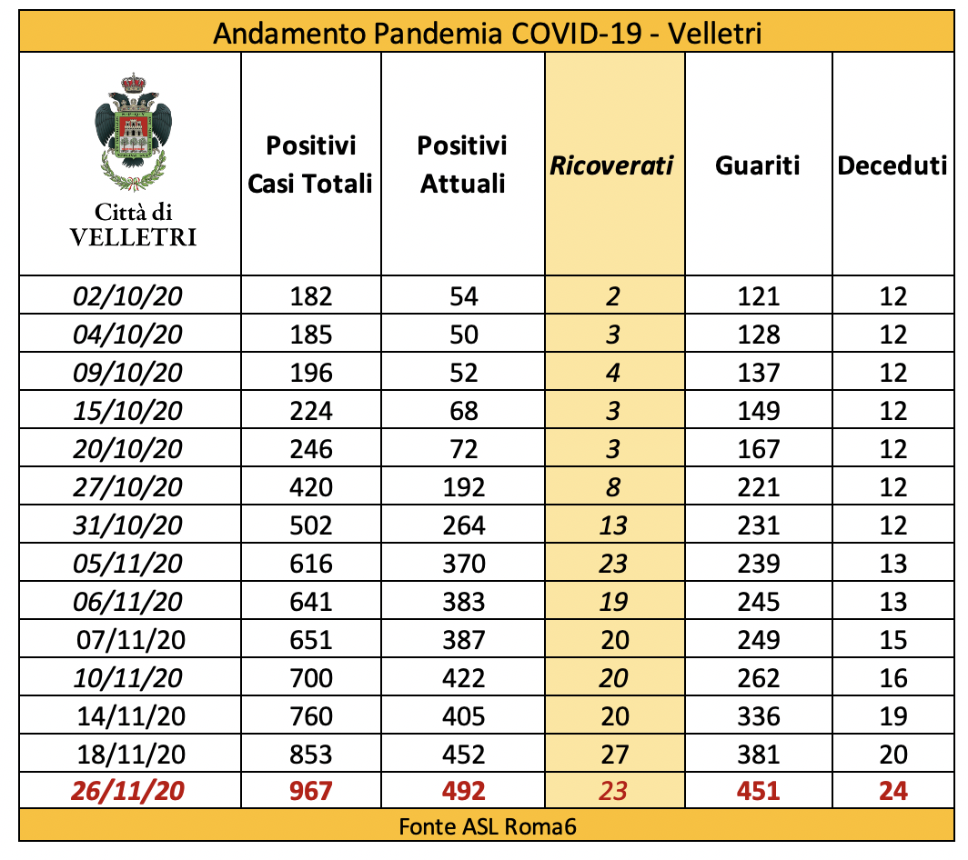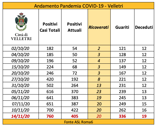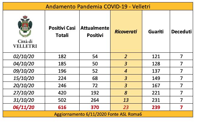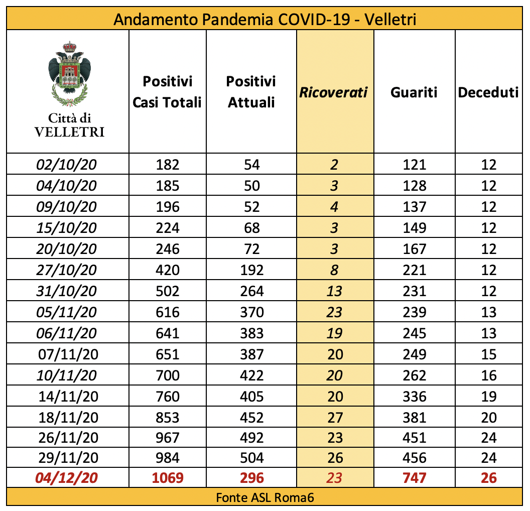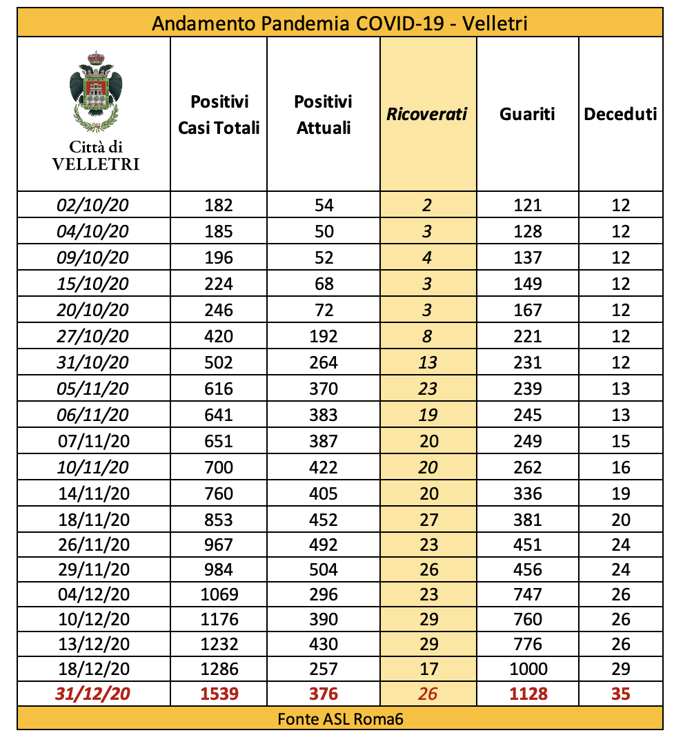 In seguito alla segnalazione del Comune di Velletri e dopo un lavoro attento di bonifica dei dati, è stata aggiornata la tabella della pandemia a Velletri. Il numero delle persone attualmente positivi si è ridotto drasticamente come già accaduto in altri comuni. Prima di procedere con la comunicazione formale abbiamo anche fatto un confronto con i dati rilevati dalla Volsca che è impegnata nella raccolta speciale dei rifiuti presso le famiglie dei cittadini colpiti dal virus. La compatibilità di tutte le informazioni ci consente di eseguire una fotografia attendibile e anche confortante vista la curva in crescita delle ultime settimane. Purtroppo, si registrano 2 decessi in più rispetto alla precedente rilevazione.