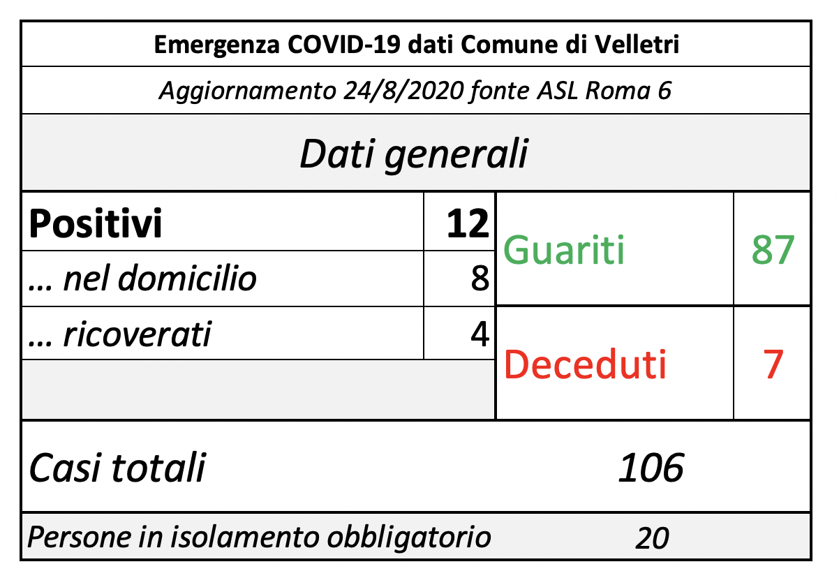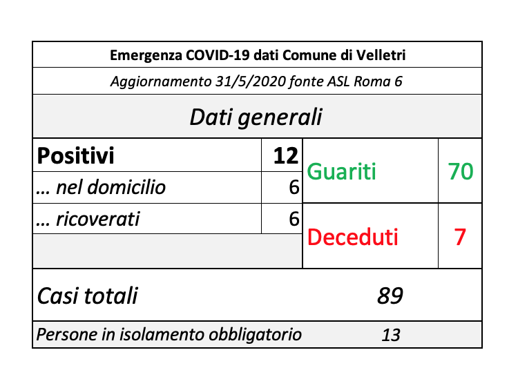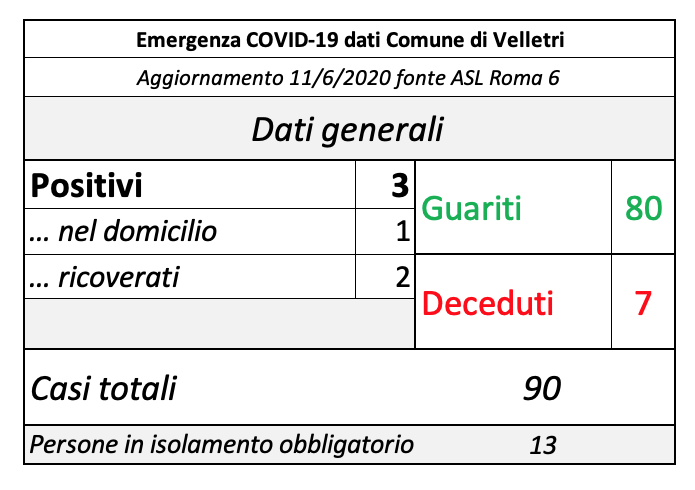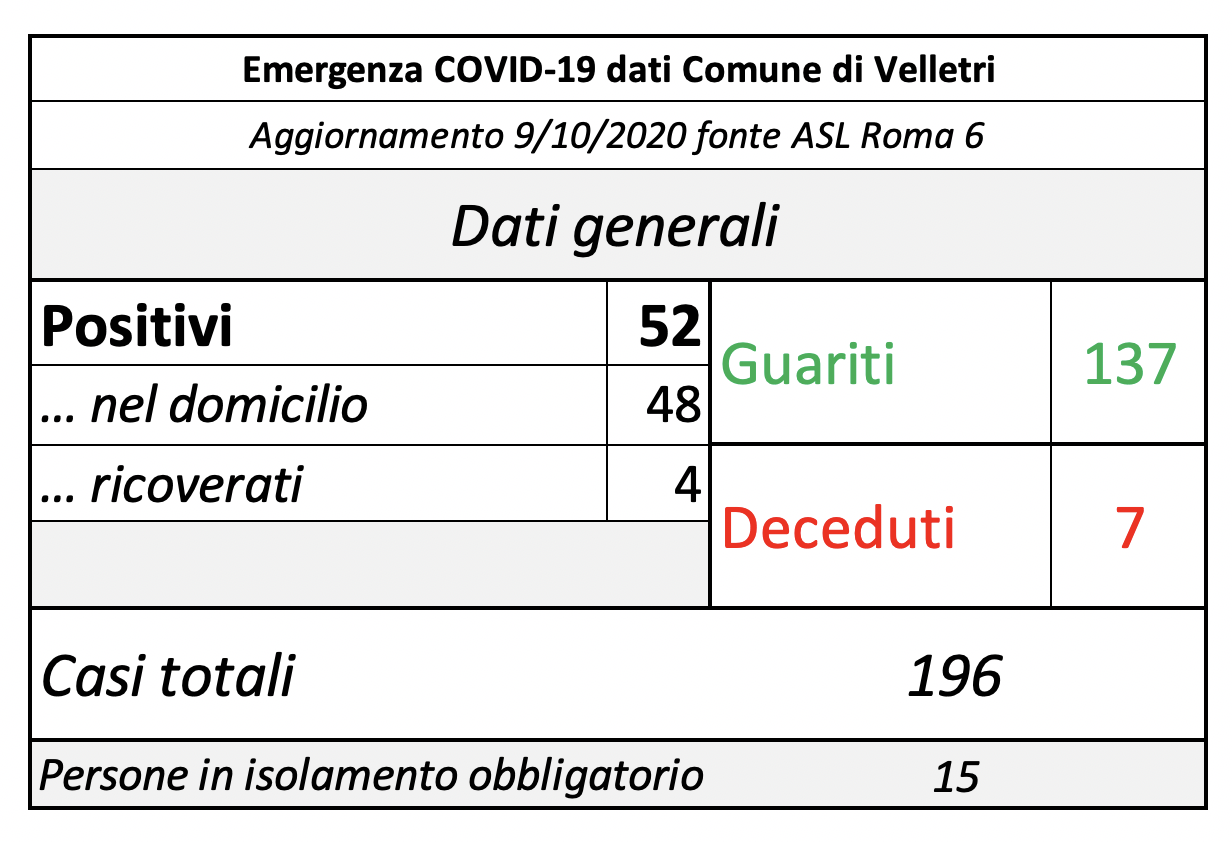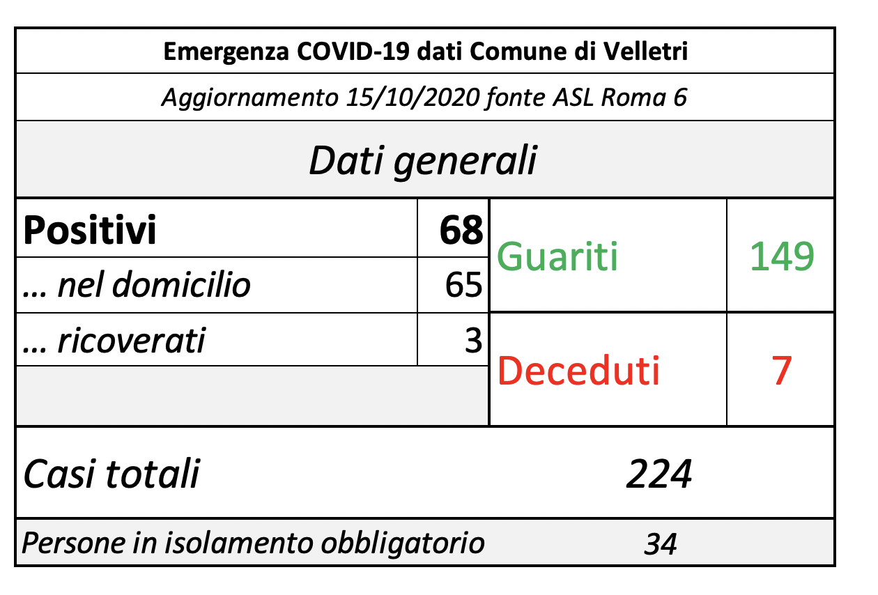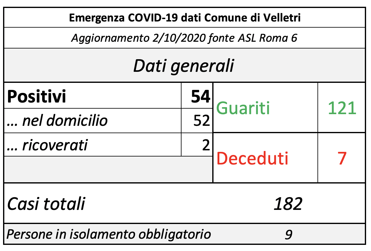 In seguito alla segnalazione del Comune di Velletri e dopo un lavoro attento di bonifica dei dati, è stata aggiornata la tabella della pandemia a Velletri. Il numero delle persone attualmente positivi si è ridotto drasticamente come già accaduto in altri comuni. Prima di procedere con la comunicazione formale abbiamo anche fatto un confronto con i dati rilevati dalla Volsca che è impegnata nella raccolta speciale dei rifiuti presso le famiglie dei cittadini colpiti dal virus. La compatibilità di tutte le informazioni ci consente di eseguire una fotografia attendibile e anche confortante vista la curva in crescita delle ultime settimane. Purtroppo, si registrano 2 decessi in più rispetto alla precedente rilevazione.