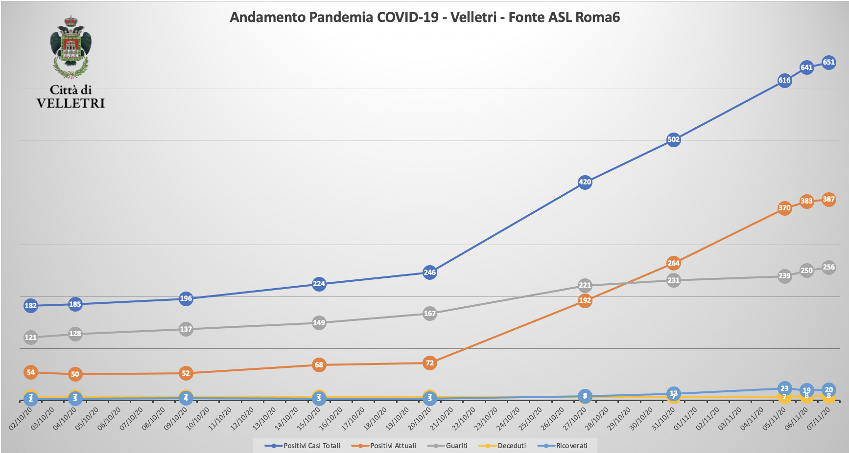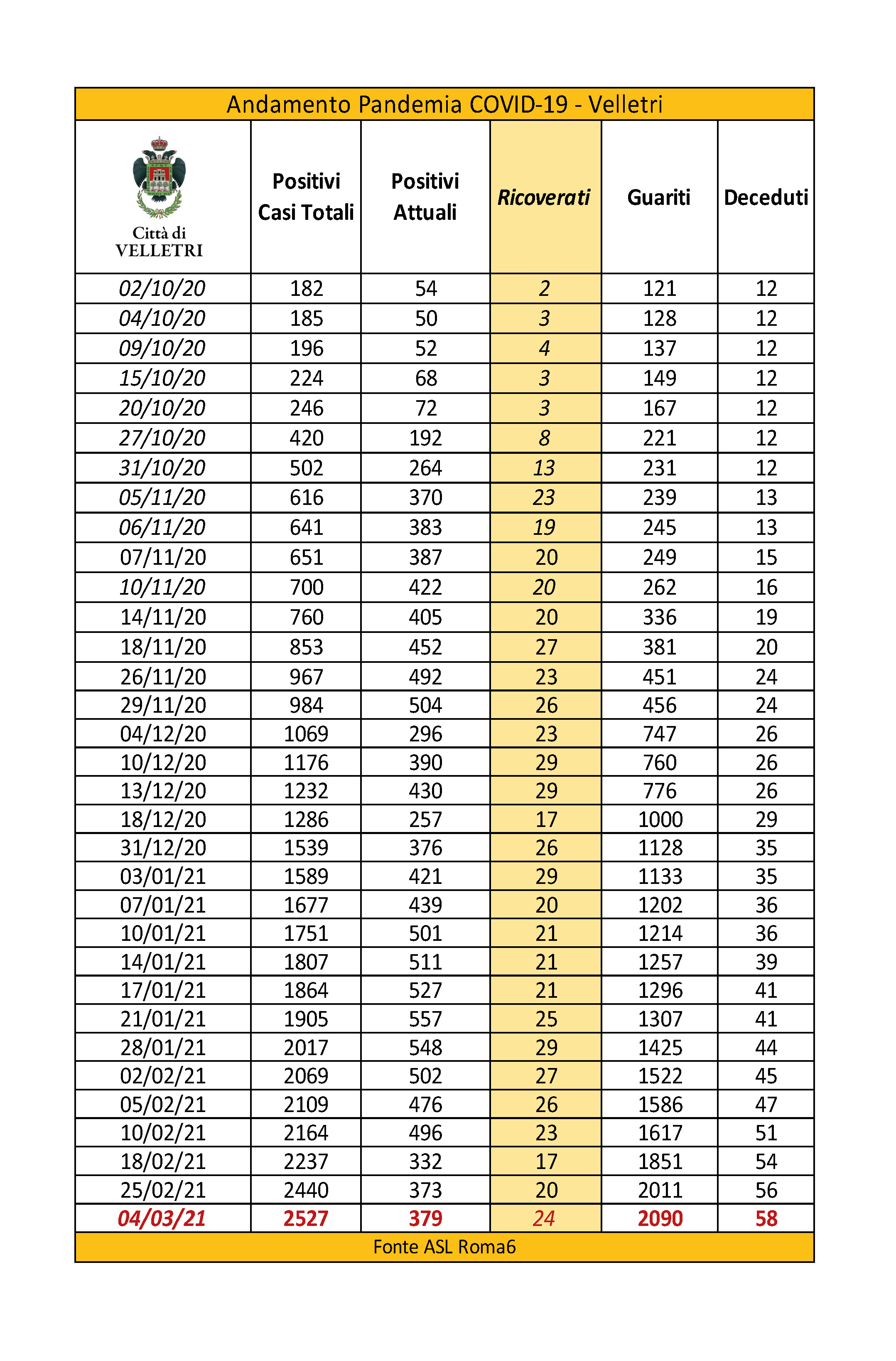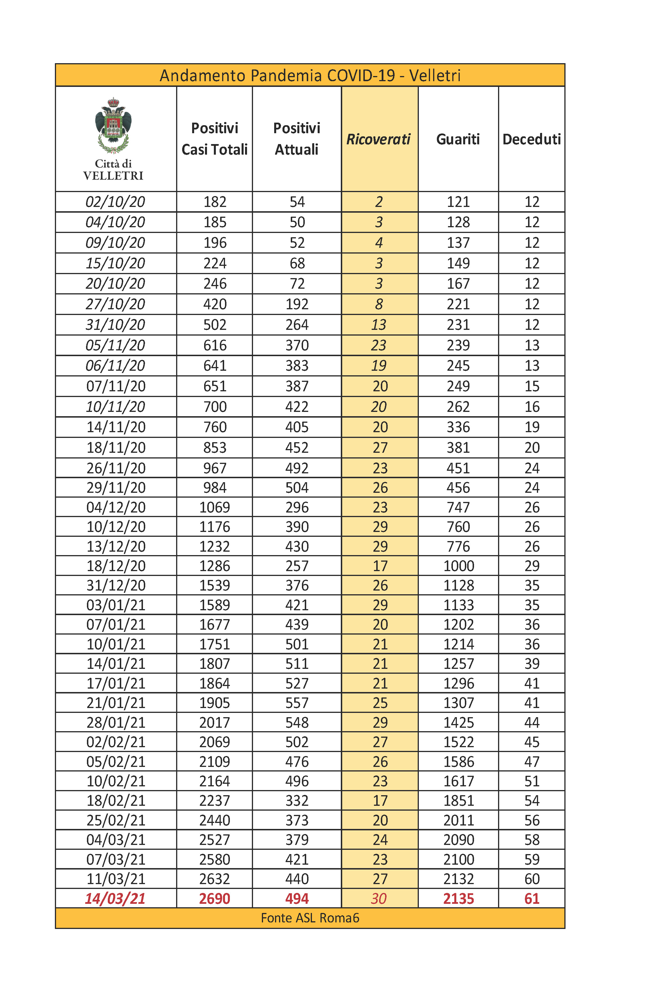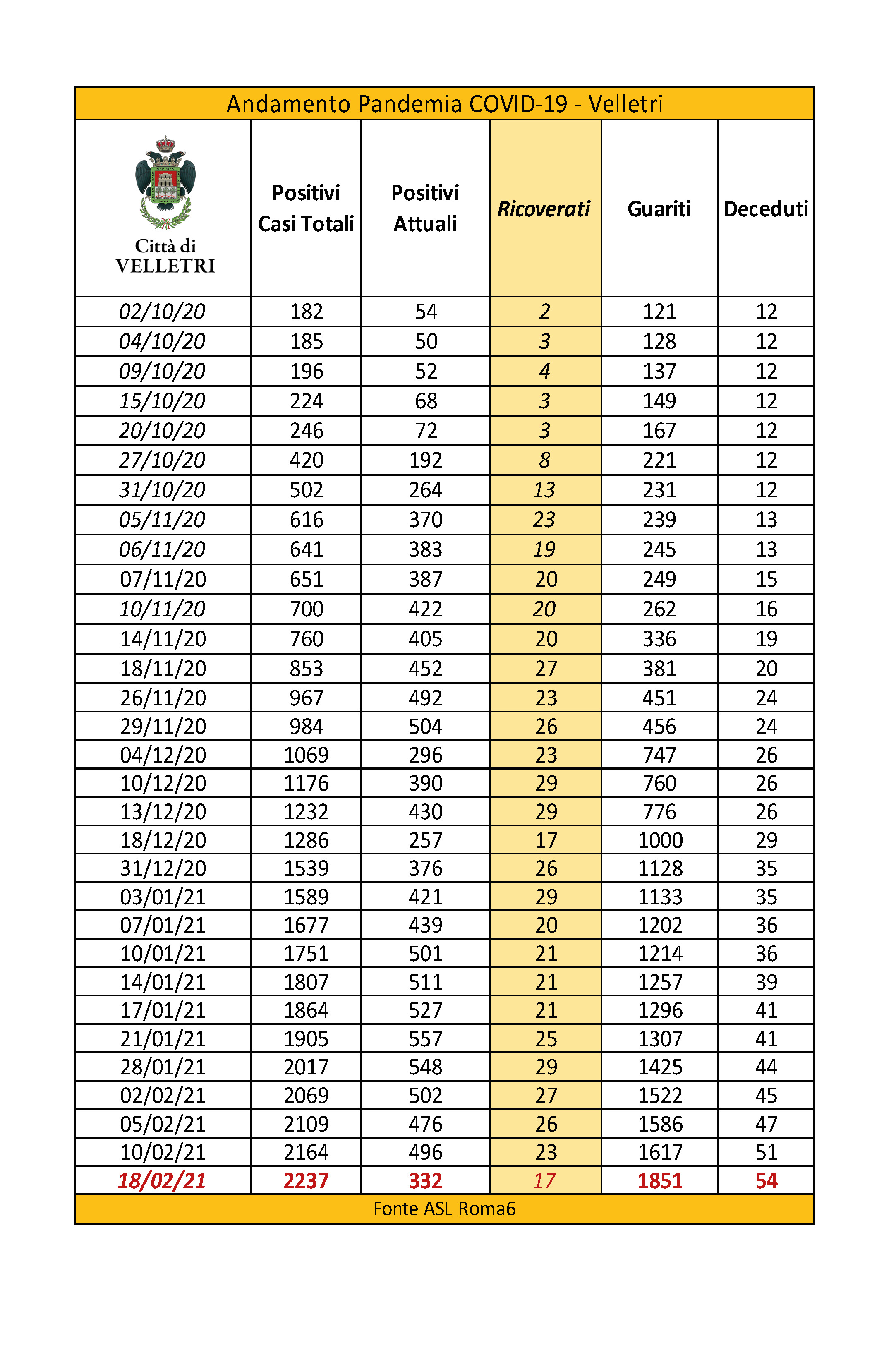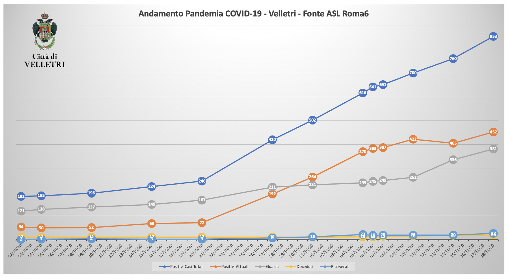 In seguito alla segnalazione del Comune di Velletri e dopo un lavoro attento di bonifica dei dati, è stata aggiornata la tabella della pandemia a Velletri. Il numero delle persone attualmente positivi si è ridotto drasticamente come già accaduto in altri comuni. Prima di procedere con la comunicazione formale abbiamo anche fatto un confronto con i dati rilevati dalla Volsca che è impegnata nella raccolta speciale dei rifiuti presso le famiglie dei cittadini colpiti dal virus. La compatibilità di tutte le informazioni ci consente di eseguire una fotografia attendibile e anche confortante vista la curva in crescita delle ultime settimane. Purtroppo, si registrano 2 decessi in più rispetto alla precedente rilevazione.