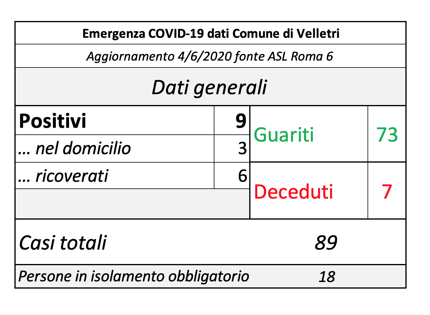 In trasparenza abbiamo aggiornato la tabella che oggi indica che i decessi, dall’inizio della pandemia, sono ben 19, purtroppo sei di questi avvenuti negli ultimi giorni.