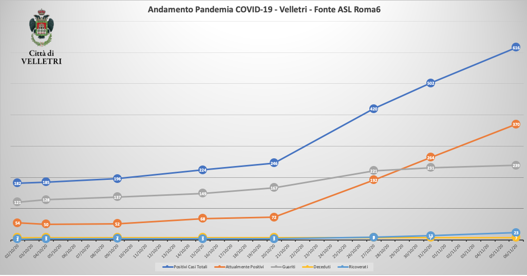 I dati dell'epidemia a Velletri registrano un significativo aumento coerente con la crescita nazionale. Resta limitato il numero dei ricoverati che sono 3, mentre l'aumento dei casi totali è significativo così come quello delle persone attualmente positive e di quanti sono costretti in contumacia.