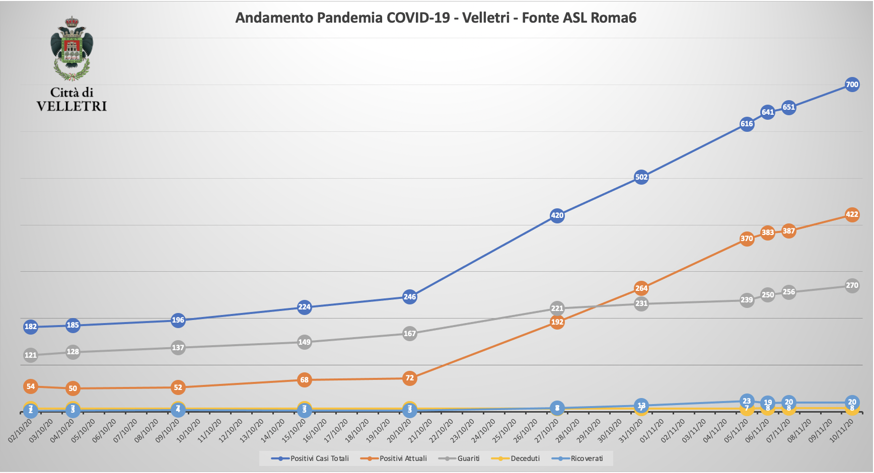 Aggiornamento tabella e grafico sull'andamento della pandemia a Velletri, abbiamo raggiunto i 700 casi totali dall'inizio della pandemia e si registra un costante aumento dei positivi mentre appare stabile il numero delle persone ricoverate. Questa mattina partecipo all'assemblea dei sindaci della Asl Roma 6 per comprendere meglio la situazione del territorio. Come annunciato ieri, il pronto soccorso dell'ospedale di Velletri è stato riaperto dopo le operazioni di sanificazione.