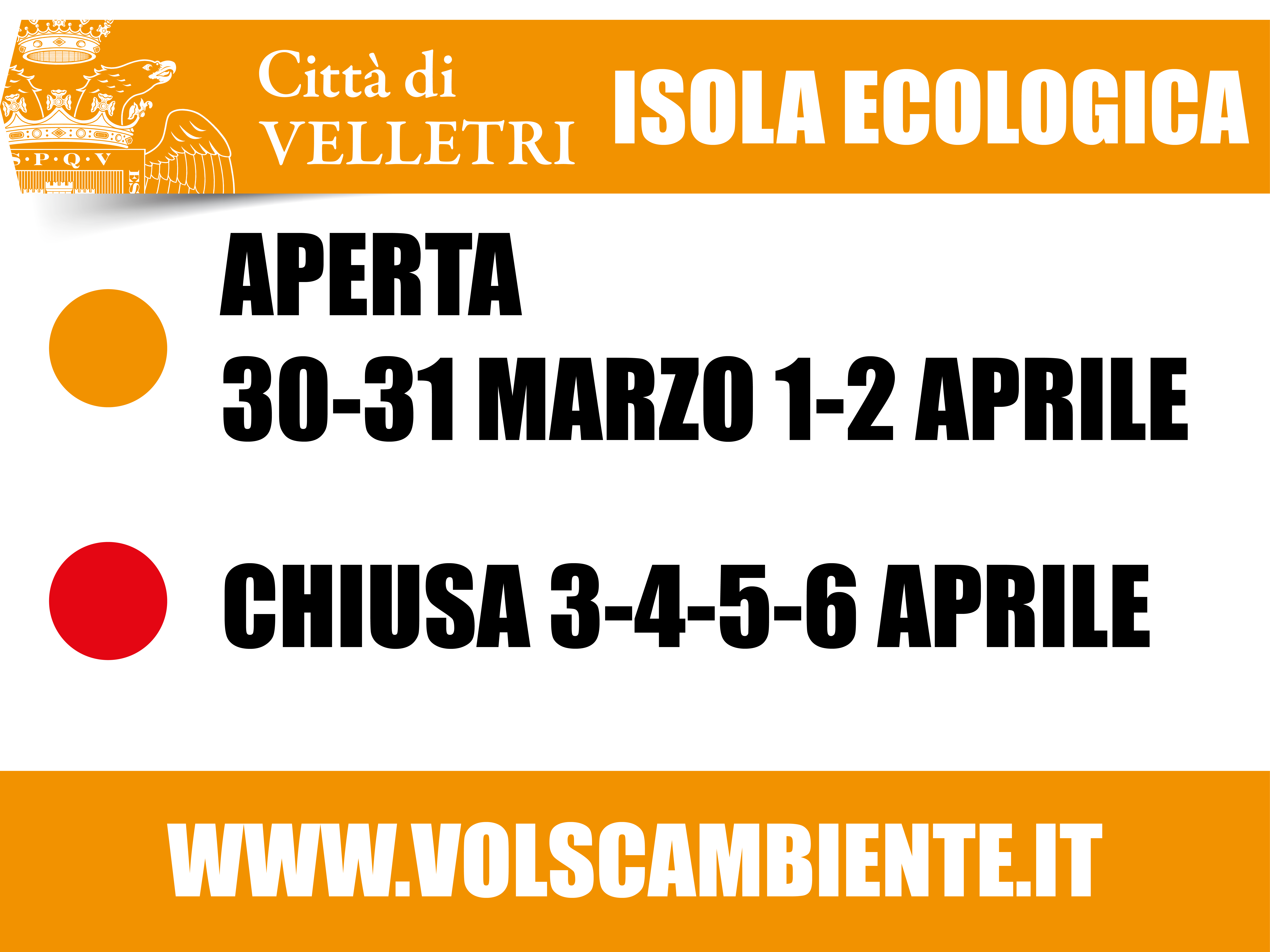 In concomitanza con lo stato di Zona Arancione per la Regione Lazio, ovvero nei giorni 30, 31 marzo e 1, 2 aprile il servizio dell'isola ecologica torna attivo il consueto calendario.