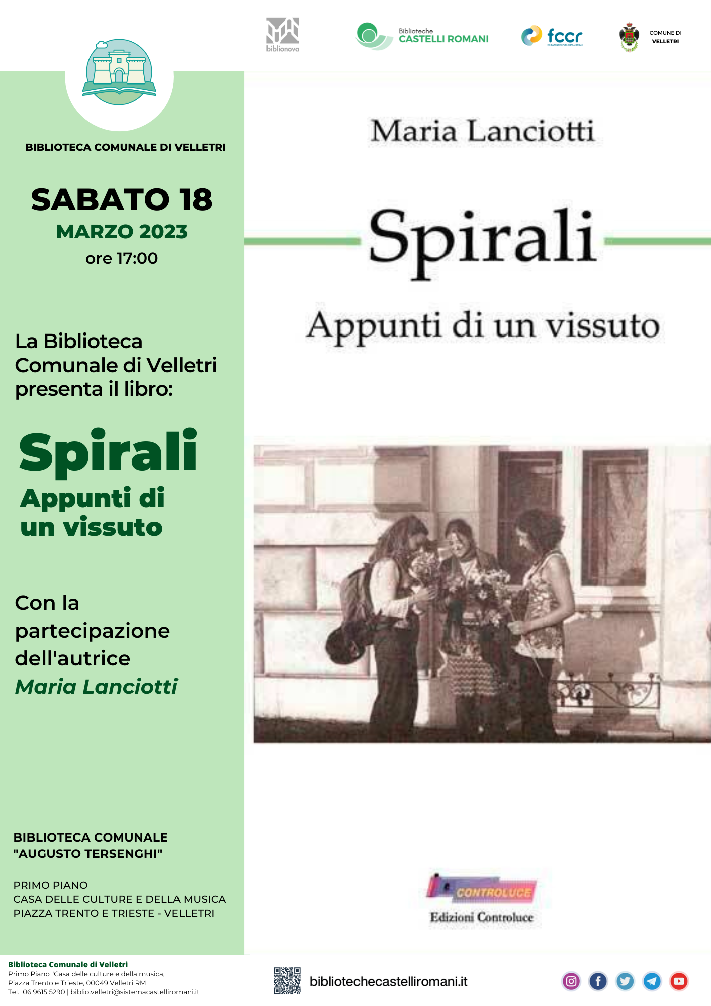 Sabato 18 marzo 2023 alle ore 17.00, la biblioteca Comunale di Velletri "Augusto Tersenghi" organizza, in collaborazione con la Societā Cooperativa "Biblionova" e con il Consorzio S.C.R. (Sistema Castelli Romani), la presentazione del libro "Spirali. Appunti di un vissuto" (Edizioni Controluce, 2022) di Maria Lanciotti. Sarā presente l'autrice.