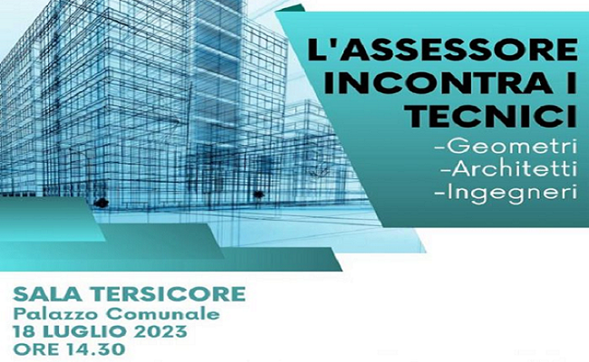 Martedì 18 Luglio, alle ore 14.30 in sala Tersicore, presso il palazzo Comunale, con la presenza dell'Ass. Monia Bastianelli, si svolgerà un incontro con geometri, architetti ed ingegneri.