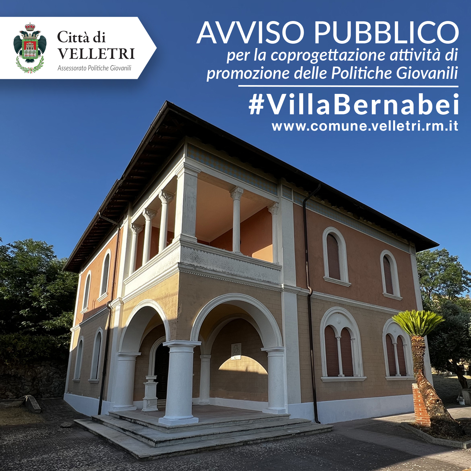 L’Assessorato alle Politiche Giovanili del Comune di Velletri invita i soggetti singoli e associati a collaborare attivamente con il nostro ente per lo svolgimento di attività volte alla promozione delle Politiche Giovanili a Villa Bernabei.