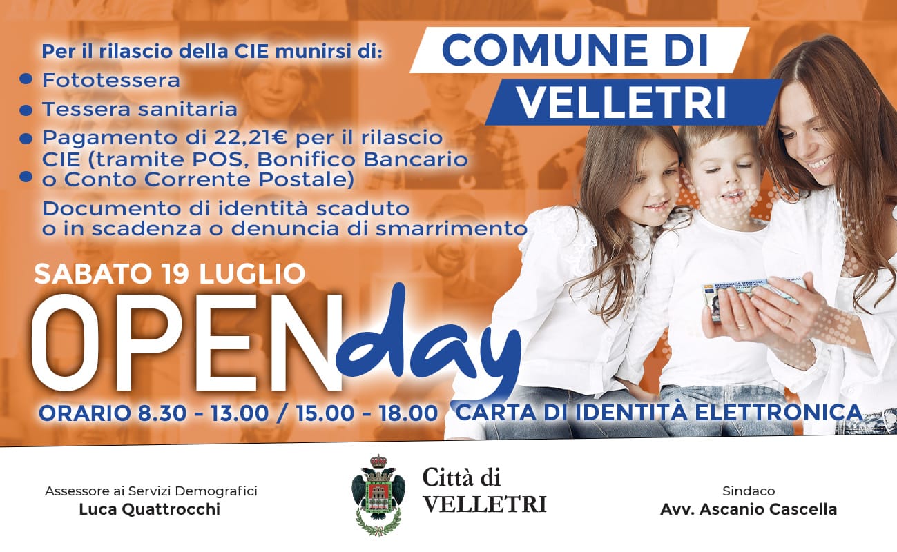 Il 19 luglio è prevista l'apertura straordinaria dell'ufficio anagrafe per il rilascio delle Carte d'Identità Elettroniche. Il servizio è attivo dalle ore 8:30 alle 13:00 e dalle ore 15:00 alle 18:00, senza necessità di appuntamento.