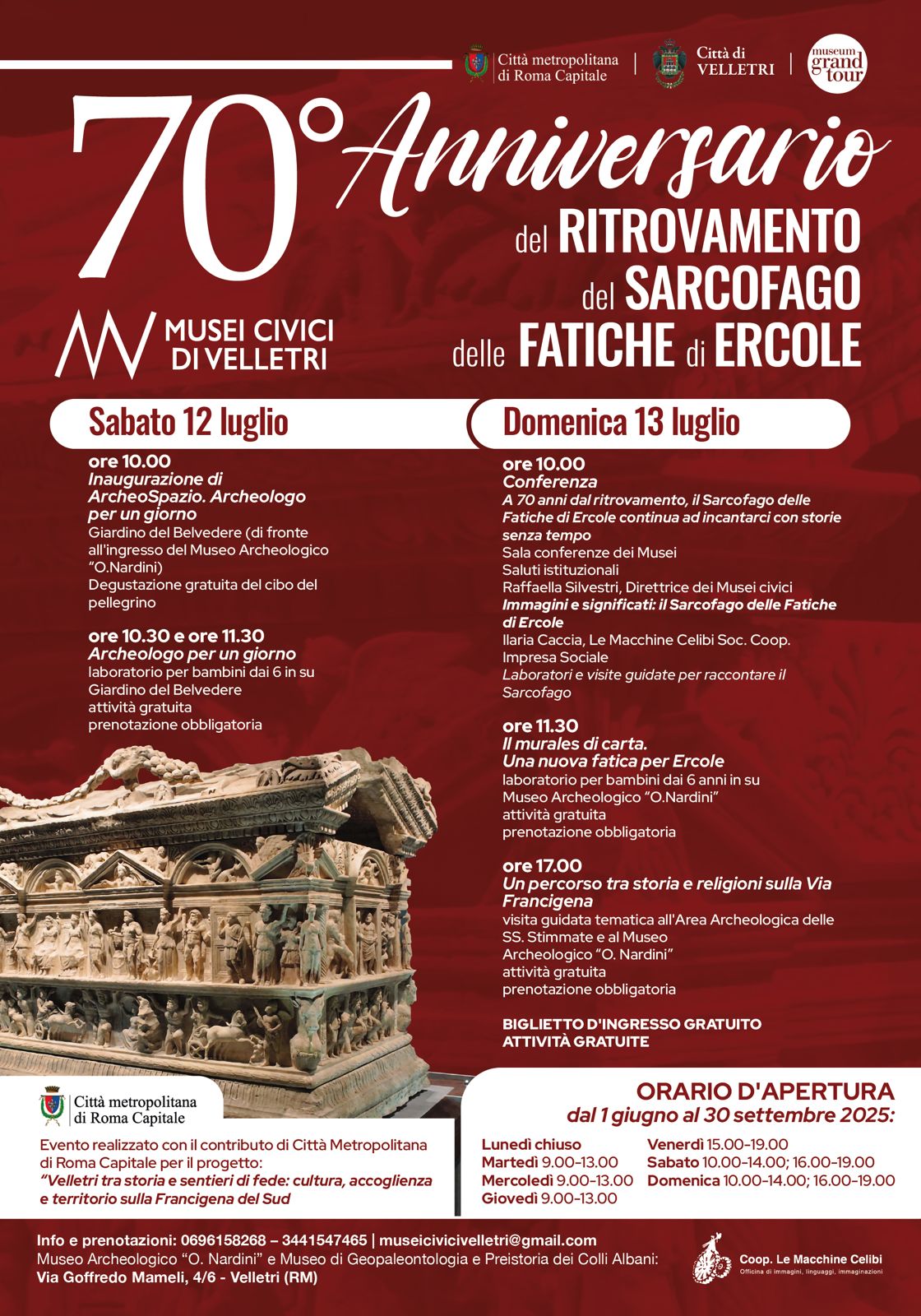 Domenica 13 luglio, sempre alle ore 10, Conferenza "A 70 anni da ritrovamento, il Sarcofago delle Fatiche di Ercole, continua ad incantarci con storie senza tempo" presso la Sala Conferenze del Museo.