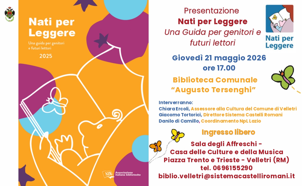 La Biblioteca Comunale di Velletri ospita la presentazione della nona edizione del volume "Nati per Leggere: una guida per genitori e futuri lettori" edita dall'Associazione Italiana Biblioteche nel 2025. L'evento si terrà giovedì 21 maggio 2026, alle ore 17, presso la Sala degli Affreschi della “Casa delle Culture e della Musica”, Piazza Trento e Trieste a Velletri ed è inserito nel programma del “Maggio dei Libri 2026”.